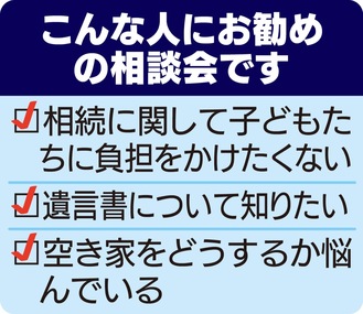 相談会は個別対応で時間は応相談、予約制(一人1時間程度)。同事務所【フリーダイヤル】0120・561・260まで申し込み(午前9時から午後8時)。来場者には相続に関するガイドブックが提供されるという。