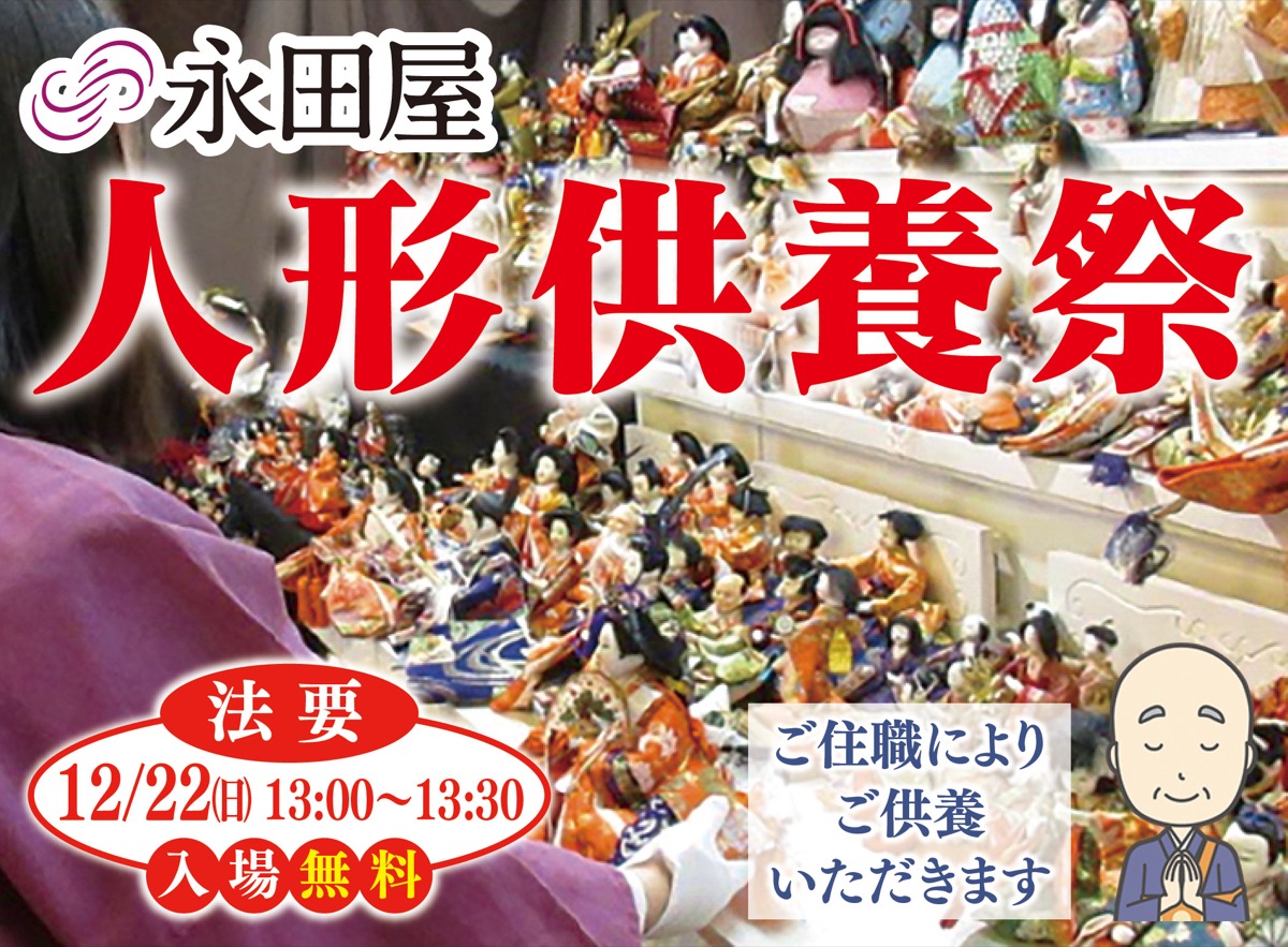 創業百十一年目、町田・相模原で11拠点を構える老舗葬儀社・永田屋は小さな家族葬ハウス(R)町田木曽で人形供養祭を開催。12月21日(土)、22日(日)に人形の引き取りを受け付ける。予約不要。