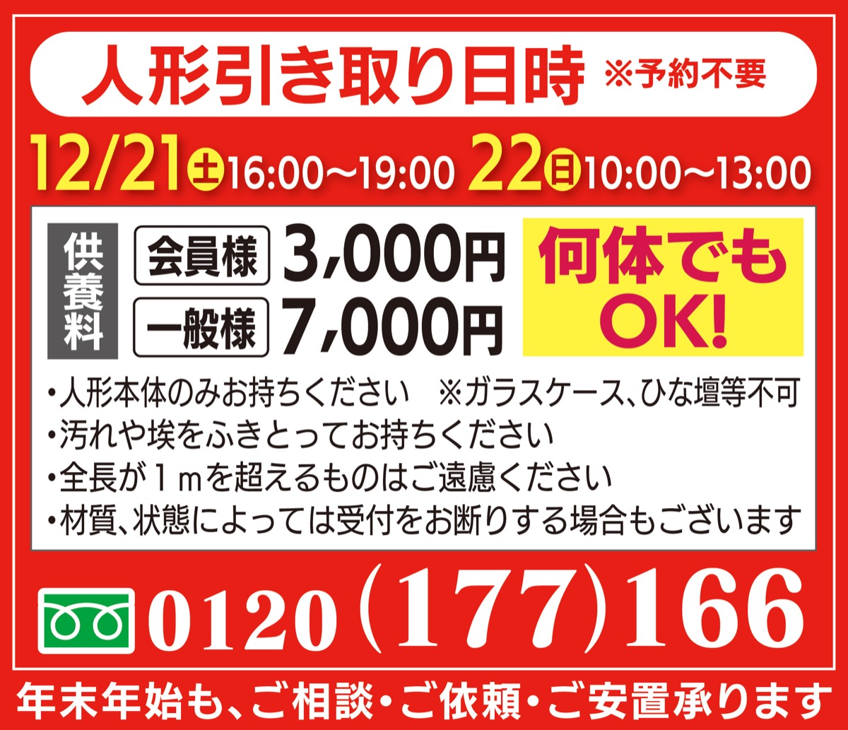 「お預りした人形をご住職に供養していただきます」。法要は22日、13時〜(自由参加・入場無料)。参加者には後日供養報告書を送付。供養料は会員3千円、一般7千円。個数制限はなし。