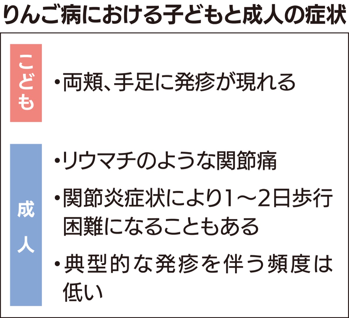 一方で感染して10〜20日後に両頬や体にレースや網目状の真っ赤な皮疹が見られるりんご病は先月、定点当たり3・75人まで増え、大人が感染することもあるという。成人が罹患した場合はリウマチのような手や足、膝などに関節炎が起き、発赤や痛みを呈するケースもあるといい、妊婦が感染すると流早産の原因になる恐れもある。