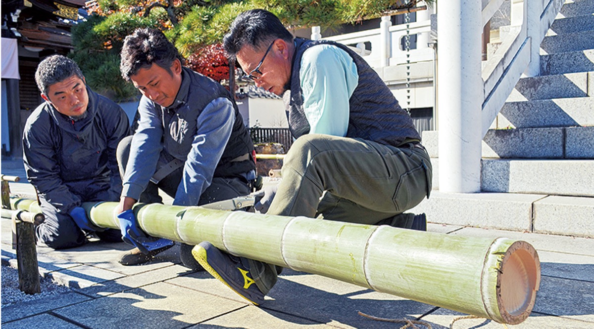 雪吊りの本場・石川県から招いた職人の指導のもと、地元の(株)鈴木造園が12月7日から8日にかけて作業を行い、園内の松と梅の木に取り付けた。支柱の竹は境内の裏に自生しているものからなるべく真っすぐなものを選んで切り出し、縄は石川県で使用されているものを持ち込んだ。