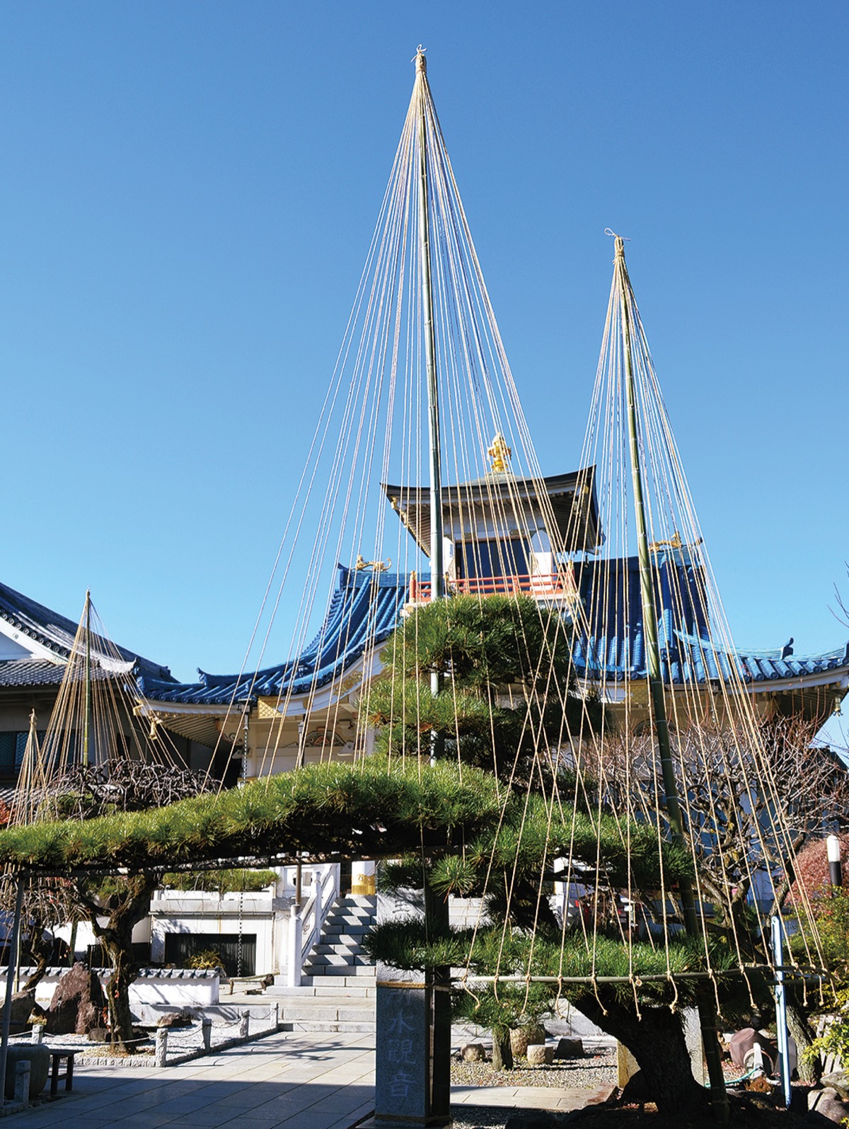 積雪の重みから樹木を守るために設置される「雪吊り」が、八王子市にある信松院の庭園に設置された。