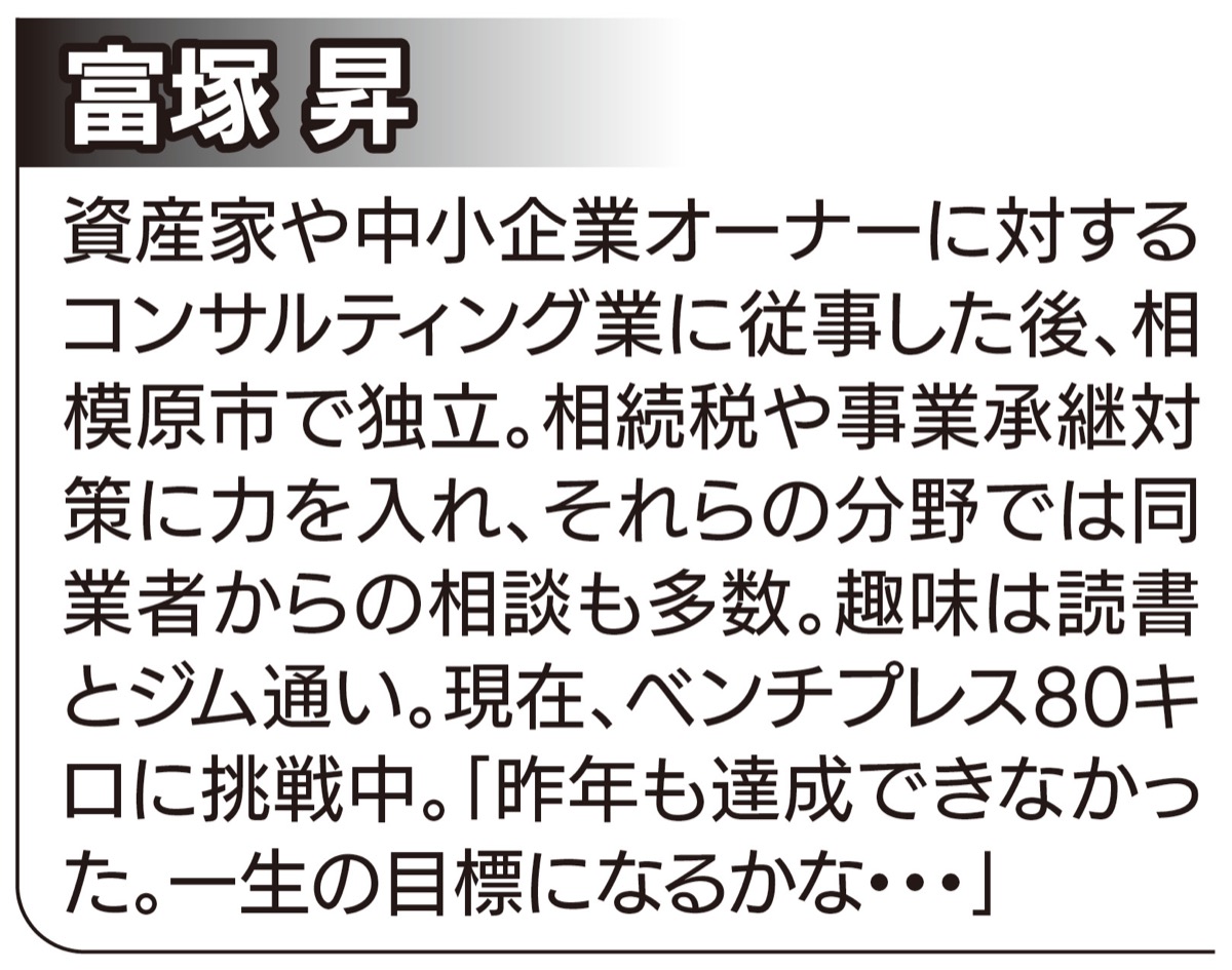 高齢者社会を迎え、増える相続に関する相談に乗ってくれるのが、中町・「税理士法人のぼる」の富塚昇代表だ。相続税申告の実績が豊富で、相談対策や納税準備などについても対応。不動産評価にも強く、「富塚先生にお願いすれば安心」との声を集めている。
