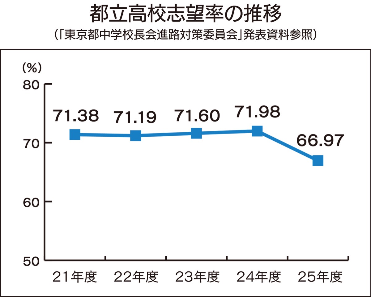 ここ数年、都立高校への志望率は71%台で推移していたものの、町田市内の教育関係者の一人は「所得制限なく、都内私立高校の授業料支援が受けられるようになった影響と考えられる。大きな声では言えないが、現在は保護者の年収が子どもの進路を左右するのは確か」と話す。