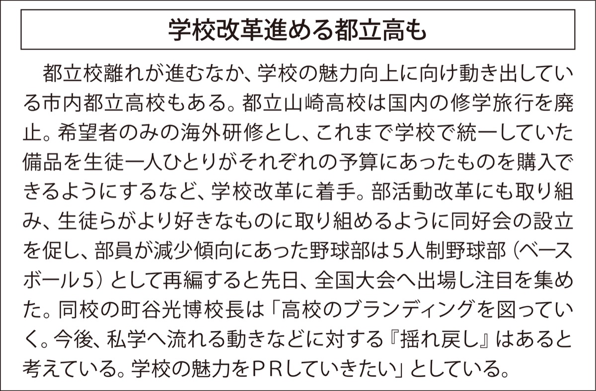 そして、「今後もこの傾向は進んでいくとみている。市内都立高には新たな魅力づくりが必要になってくるのではないか」と話している。