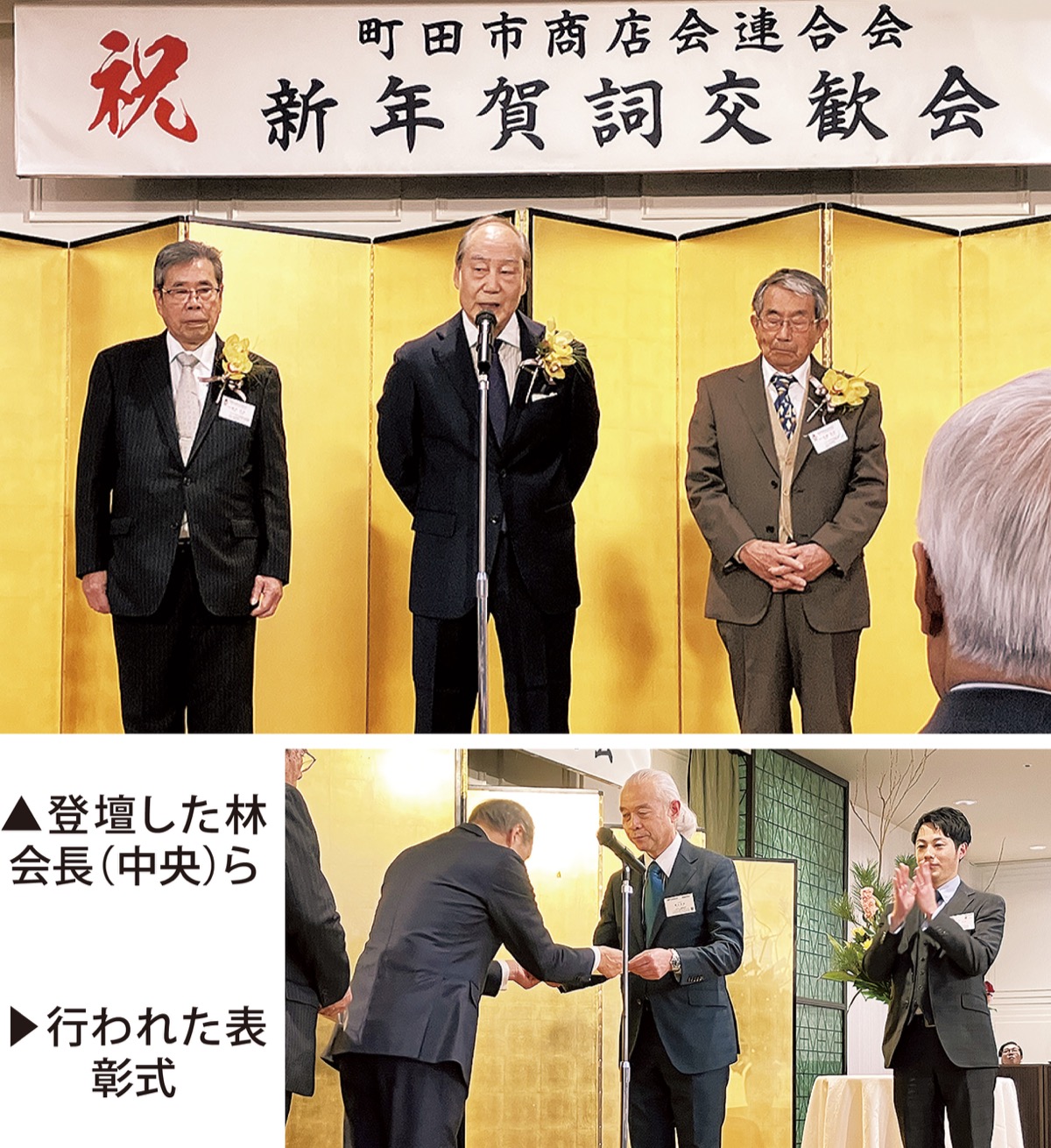 20を超える商店会が加盟する町田市商店会連合会の「新年賀詞交歓会」が先ごろ、原町田のホテルで開かれた。会場には各商店会の会員のほか、石阪丈一市長や澤井宏行・町田商工会議所会頭ら来賓が来場。新年を祝った。