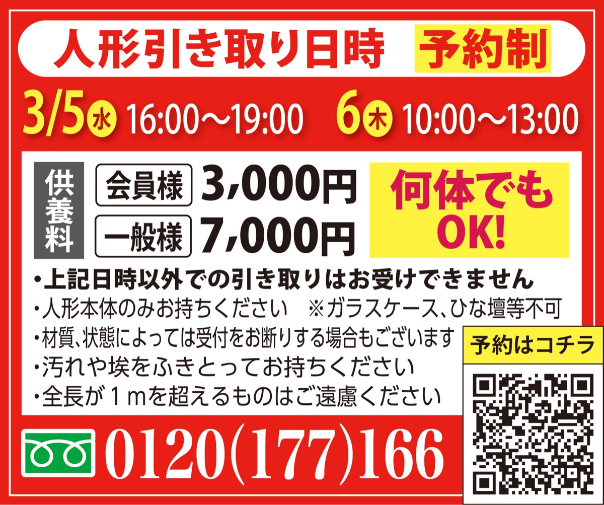 「お預りした人形をご住職に供養していただきます」。法要は6日、13時〜(自由参加・入場無料)。参加者には後日供養報告書を送付。供養料は会員3千円、一般7千円。個数制限はなし。