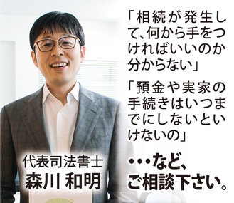 相続に関する無料の個別相談会が4月7日(月)から、11日(金)までJR町田駅近くの森川司法書士事務所で開かれる。相続が発生する前に準備すべきことや相続後の対応について相談できる。各日、10組限定で午前10時から午後8時の間。予約制(一人1時間程度)、同事務所【フリーダイヤル】0120・561・260まで申し込み(午前9時から午後8時)。相談者には相続に関するガイドブックが提供される。同事務所の森川和明代表は「別日程でも対応させて頂きます。お問い合わせ下さい」