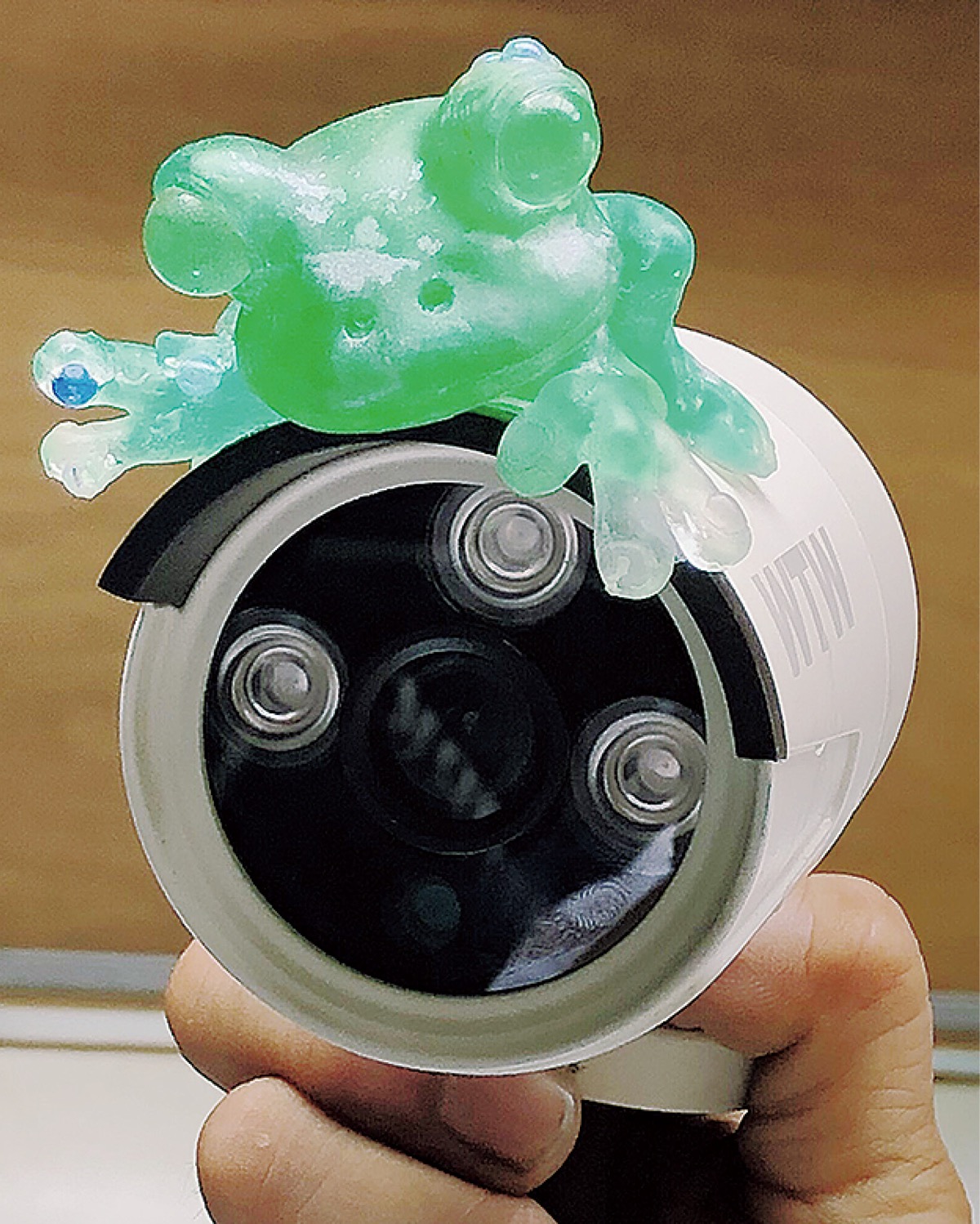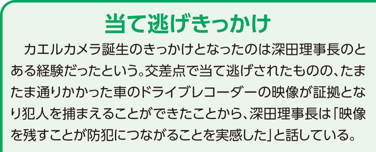 カエルカメラは道路側に向けた防犯カメラの上に「ケロちゃん」と名づけられたカエルの人形が座るもので、「地域を見守り、安全に帰る」という思いで制作されたものという。深田理事長は「町田市内の社会福祉法人に制作をお願いしている。地域貢献の一環。カエルカメラによってみなが笑顔になれば」と話している。