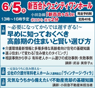 そこで今回のセミナーでは、元気なうちから準備すべく、1部では相談実績豊富な講師から高齢者向け住宅の基礎知識、選ぶ住まいで変わる住み替えのタイミング等を学ぶ。2部では公社が事業主の「ヴィンテージ・ヴィラ(入居一時金2449万円〜)」も紹介。また3部では、小田急不動産(株)の担当者が、新百合ヶ丘周辺の不動産市場や売却時に知っておきたい基礎知識を伝授。所有不動産の売却と住み替えを検討している方はぜひご参加を。