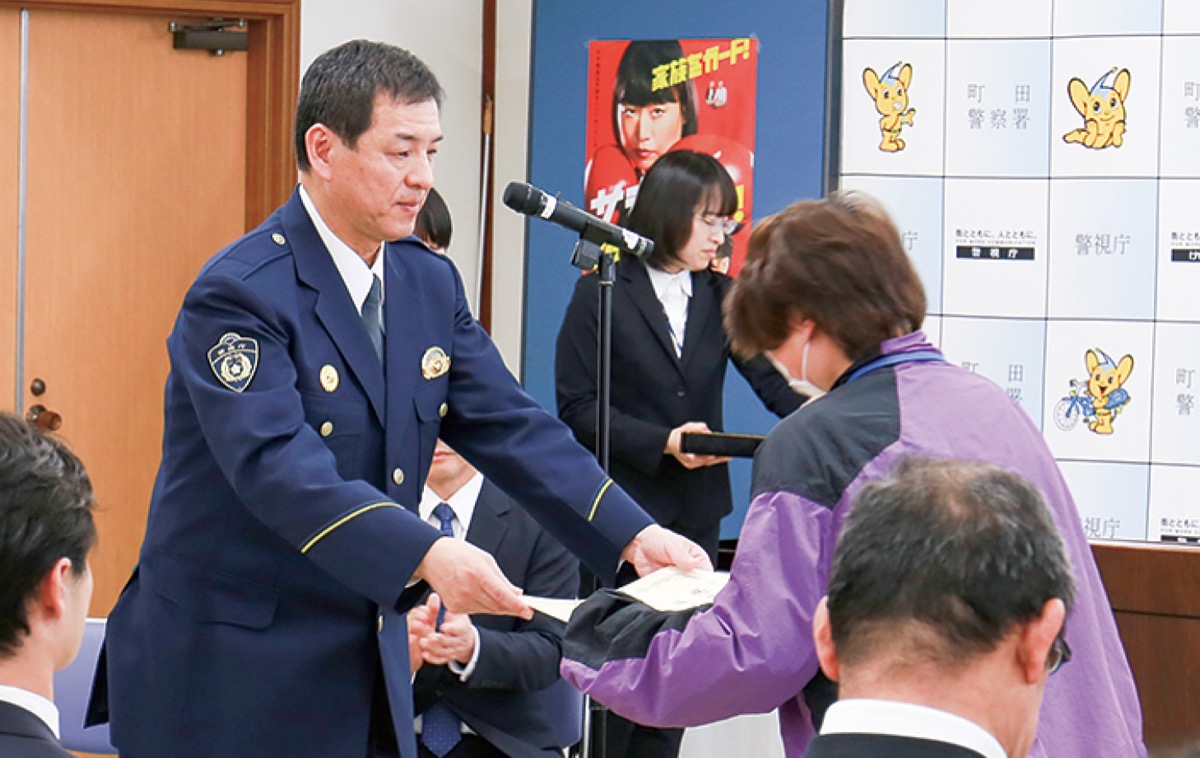 町田署で開かれたこの式典に参加した東京ガスライフバル澤井(株)の澤井宏太さんは「事業を通じて単身高齢者と接点をもつ機会が増え、特殊詐欺の被害防止を呼びかけるチラシ配布などを開始した。アドバイザーとして協力していきたい」と話している。