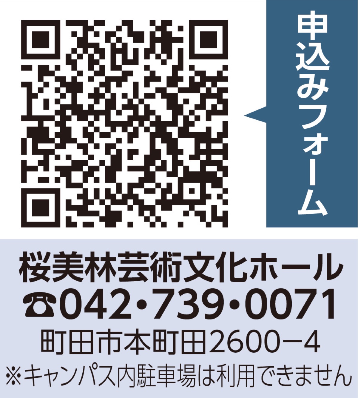 時間は午後2時(開場は1時)から。一般は2千円、学生(6歳から25歳)は千円で未就学児入場不可。事前予約制で全席自由席。申し込みは専用フォームまたは電話のほか来館して。支払いは当日現金で。問い合わせは同ホール運営事務局【電話】042・739・0071(平日/午前10時から午後4時)。