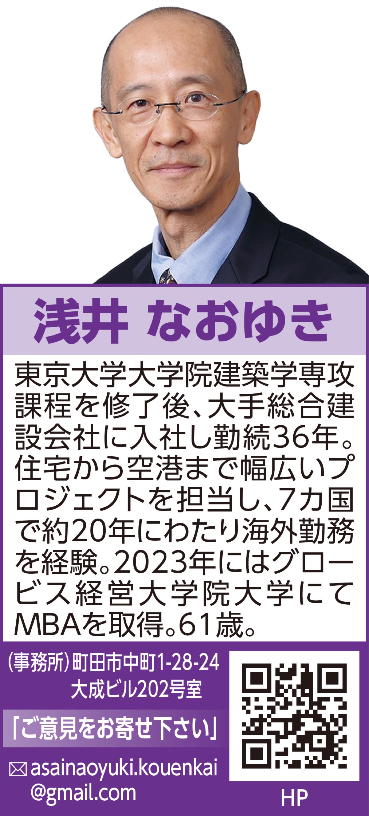 まず、人口減につながる失われた30年を生み出した「議論のない議会」「しがらみに縛られた政治屋」などを一掃する必要があります。そして、私のような国際的ビジネス思考をもった「普通の人」が政治担当いち市民としての視点をもって街づくりに関わり、未来を変えていかなければならないと思います。