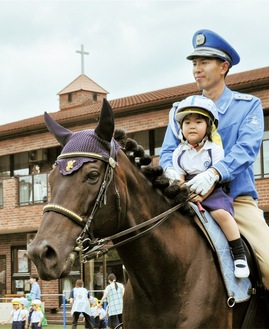 小山ヶ丘の町田サレジオ幼稚園で6月20日、恒例の交通安全教室と警視庁騎馬隊による乗馬体験が行われた=写真。園児たちは、馬の迫力に触れながら、交通ルールを学んだ。