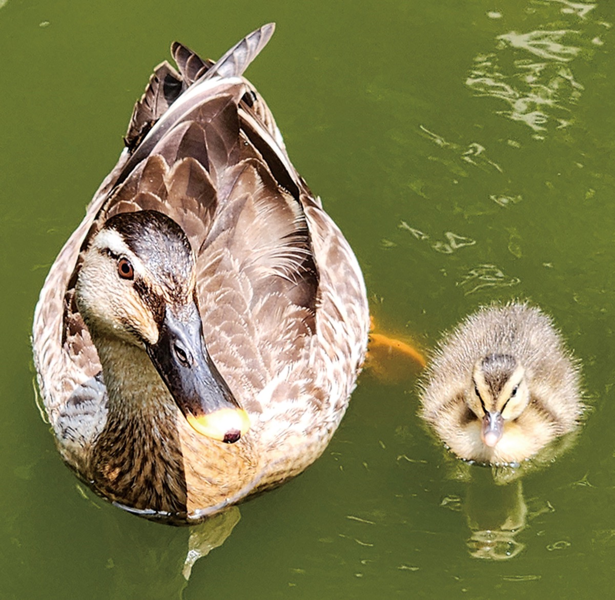 有料老人ホーム「コンフォートロイヤルライフ多摩」(下小山田町)の中庭にある池で先ごろ、カルガモ親子の姿が見られた。施設担当者によると、5月末に1組のつがいが飛来し、産卵。6月19日には、雛がふ化し、小さな体で親鳥の後を懸命に追いながら泳ぐ様子が、入居者や職員を喜ばせた。施設の池でカルガモの親子の姿が見られたのは5年ぶりのことという。