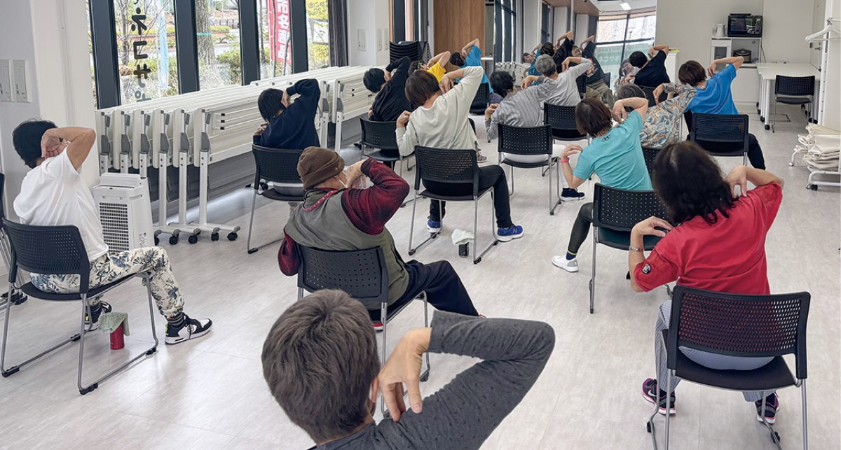 座ったままできるチェアーズンバの普及にも力を入れている杉山さん。先ごろ、木曽の「ネコサポステーション木曽」でイベントを開催し=下写真、初心者から経験者までが年齢や体力に合わせて、チェアーズンバに挑戦したという。