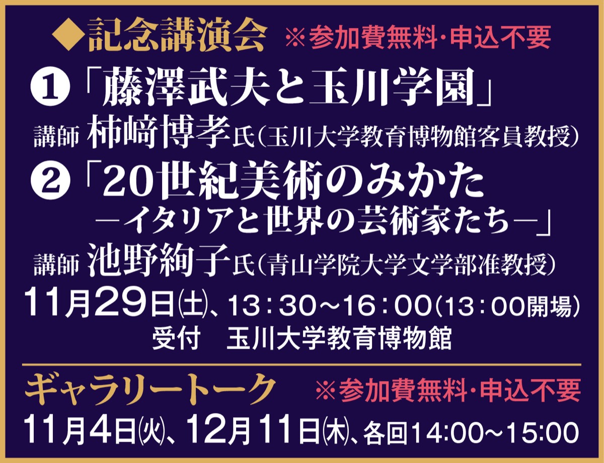 一般の観覧可能で入館無料。時間は各日午前9時から午後5時まで。日曜日(一部を除く)と11月10日(月)〜14日(金)は休館。関連イベントとして記念講演会やワークショップ、ギャラリートークあり。期間中に大幅な展示替えがある。教育博物館へは小田急線「玉川学園前」駅南口より徒歩約15分。