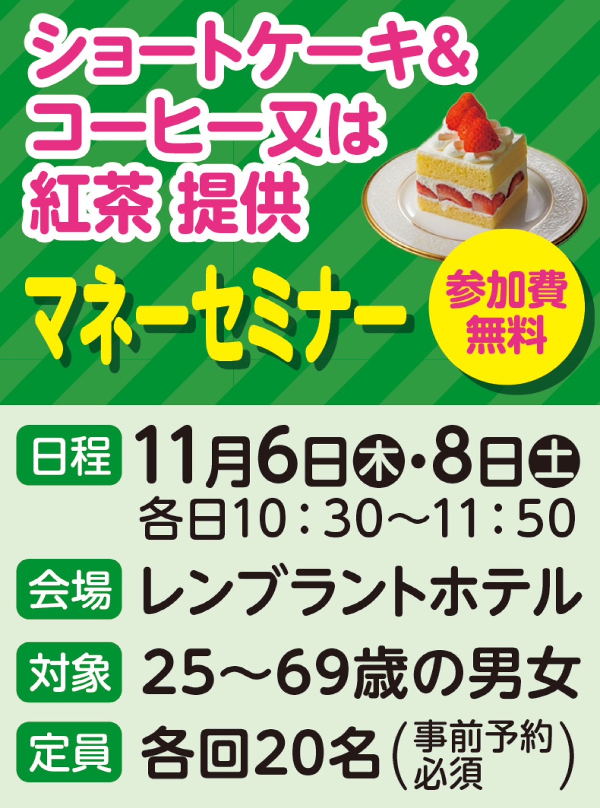 子育て・教育資金から老後資金、資産運用、相続などのお金について学ぶことができるマネーセミナーが11月6日(木)・8日(土)、JR町田駅徒歩2分のレンブラントホテル東京町田で開かれる。「将来への漠然とした不安を解消してくれる」との声を集める資産アドバイザーの蔵野雅章さんが開くマネーセミナーでライフプランの幅広い悩みに対応。新NISA、iDeCoも初歩からわかりやすく解説してくれるという。対象は25〜69歳の男女で参加無料。時間は両日共に午前10時30分開始、11時50分まで。各定員20人・事前予約制。申し込み・詳細は専用の二次元コードから。(問)ファイナンシャル・ジャパン(株)蔵野さんまでメール(masaaki.kurano@financialjapan.jp)または電話【携帯電話】090・5766・4889まで。