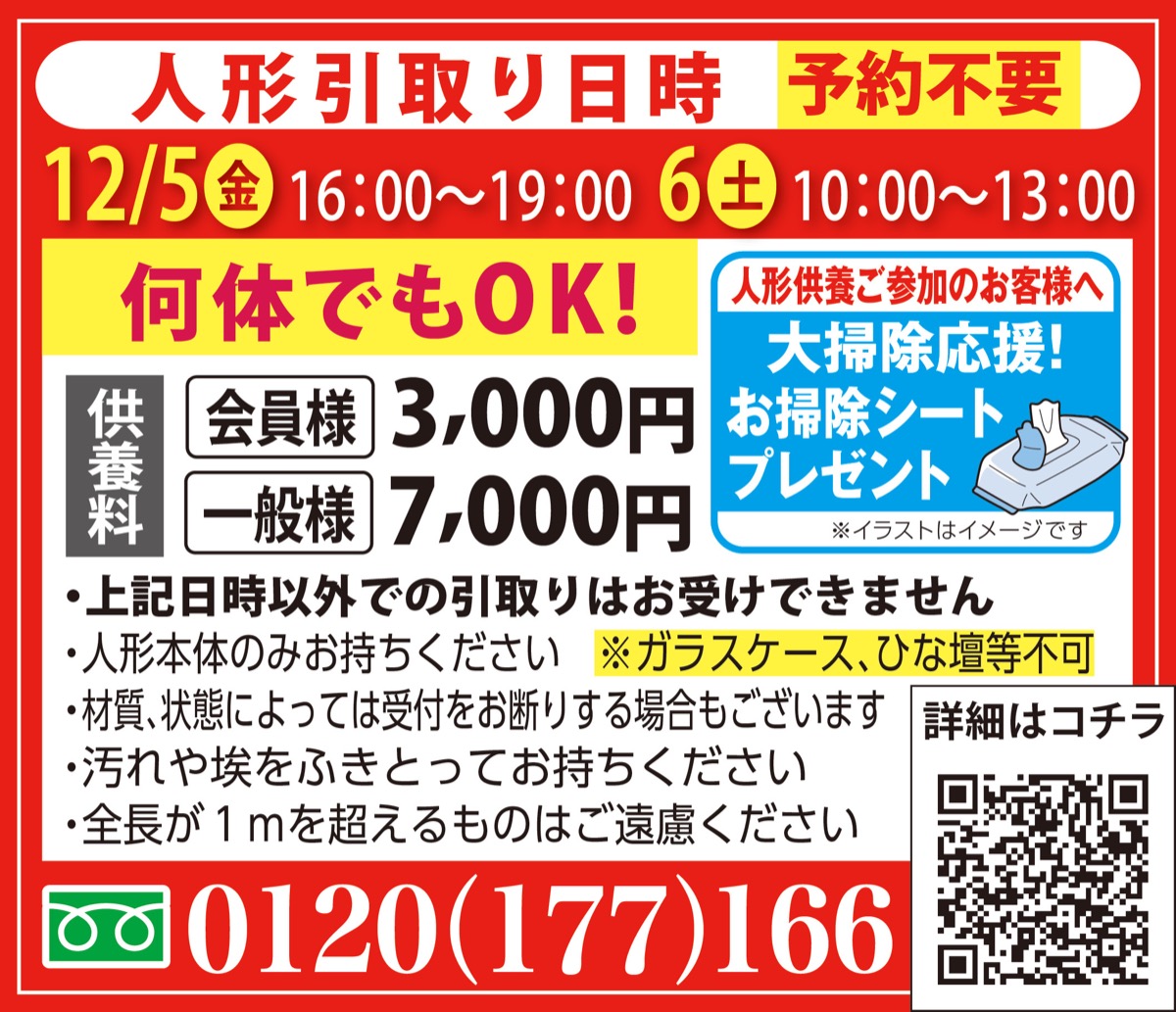 「お預りした人形をご住職にご供養いただきます」。法要は6日、13時〜(自由参加・入場無料)。参加者には後日供養報告書を送付。供養料は会員3千円、一般7千円。個数制限はなし。詳細は気軽にお電話を。