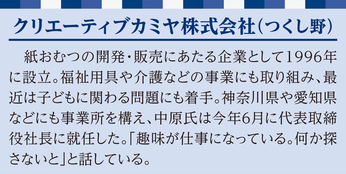 町田市を拠点に躍進する企業の新社長を尋ねるコーナー。今回はつくし野を拠点に紙おむつ事業からスタートし福祉用具、介護、看護などの分野まで取り組みを広げるクリエーティブカミヤ株式会社の中原英喜・代表取締役=写真=に聞く。