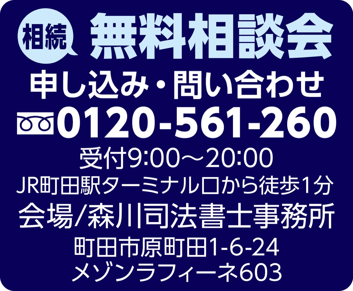相続に関する無料の個別相談会があす12月12日(金)から年末にかけてJR町田駅近くの森川司法書士事務所で開かれる。相続が発生する前に準備すべきことや相続後の対応について相談できるもので、12月25日(木)までの午前10時から午後8時の間で希望日を申し込み。一人1時間程度で、町田市関連の催しや大学などで相続に関する講演を行っている森川和明氏が相談に乗る。相談者には相続に関するガイドブックが提供されるといい、申し込み・問い合わせは同事務所0120・561・260まで申し込み(午前9時から午後8時)。