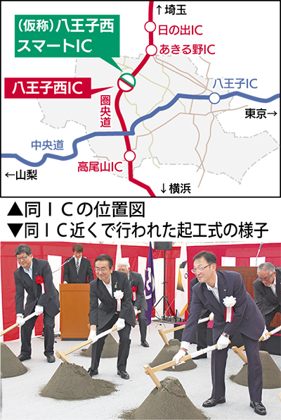 圏央道・八王子西IC(美山町・ハーフインターチェンジ)のフル化に向けた工事が6月25日、2016年中の完成を目指し始まった。フル化が実現されると、これまで中央道からの乗降のみだった同ICから、関越道方面へアクセスすることが可能となり、高速道路利用者の利便性の向上が期待される。また、市は圏央道を通じた埼玉方面との防災に関する協力体制の強化を図ることが可能となる。新たな入口は、ETCでのみ利用できる「スマートインターチェンジ」となる予定だ。