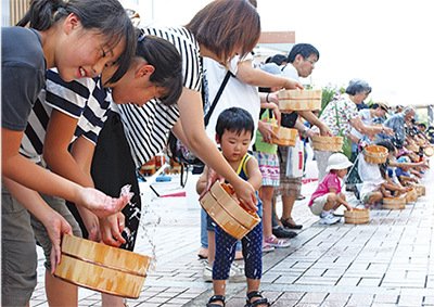 「せいやっ」「せいやっ」――。和太鼓グループの演奏が始まると親子連れなど約100人がデッキ前に。主催する「元気な街」南大沢協力の会(淡路二正会長)に所属する「三井アウトレットパーク多摩南大沢」の伊藤斉朋所長の掛け声の後、同会が用意した二次使用水が参加者らによって一斉にまかれた。「水しぶきを見ているだけで涼しくなる。楽しい」と笑顔で話す参加者。