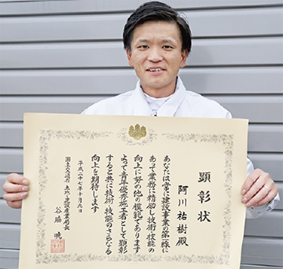 今年度から始まった国交省の顕彰制度「建設ジュニアマスター」を犬目町の建築塗装業、阿川祐樹さん(34)が受賞した。この賞は39歳以下が対象で、建築現場で10年以上の実績があり、技術優秀な人に与えられる。建築にかかわる業種全般で、全国で110人が受賞したが、建築塗装の分野では2人だけという。