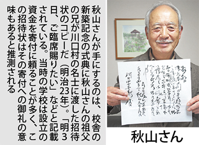 「明治8年と言えば、『花燃ゆ』の時代。その頃からずっと続いてきている。こんな小さな村だったが先人たちの教育への思いは相当なものだったはず」。140周年の実行委員長を務める秋山勝男さん(77・上川町在住)は、感慨深く話した。1976年に発行された「百年のあゆみ」(創立百周年記念事業協賛会発行)によると、上川地区には安政年間(1854〜1860)にはすでに私塾があり、千人同心(江戸時代の幕臣集団)の流れをくんだ人格主義的な内容の教育がされていた。