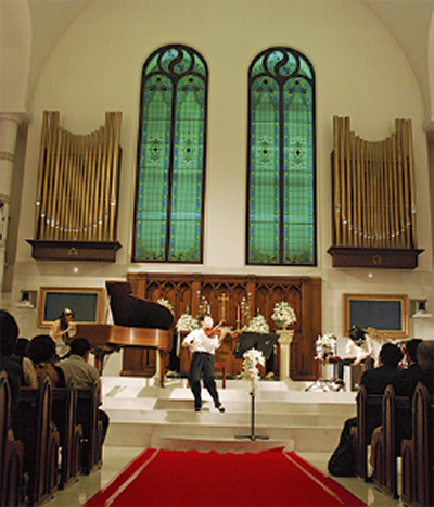 CCC主催による第72回チャペルコンサートが11月17日、大和田町の八王子ホテルニューグランド別館チャペルで行われた。女性3人によるインストユニットがステージに立ち、観衆を魅了した=右上写真。