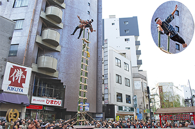 八王子消防記念会(吉水利夫総代=79)による「はしご乗り」が1月7日、八王子駅北口周辺で行われた=写真。
