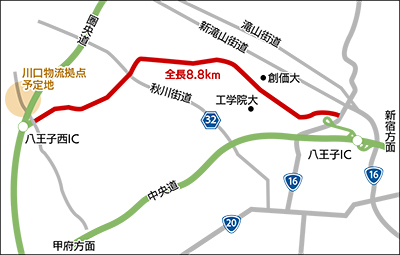 北西部幹線によってつながるエリアは川口地区にできる物流拠点予定地も含まれる。市によると「圏央道が全線開通すれば、首都圏の大きな道路網が完成する。それを効果的に活用するためには生活道路としての一般道(北西部幹線)が必要になる」と話す。八王子西インターは現在、中央道方面からの出入りのみ可能だが、来年度には関越道方面にも対応したフルインター化が予定されており、利用者の増加が見込まれる。物流の観点からするとインターのフル化、物流拠点、そして北西部幹線がセットになるという。