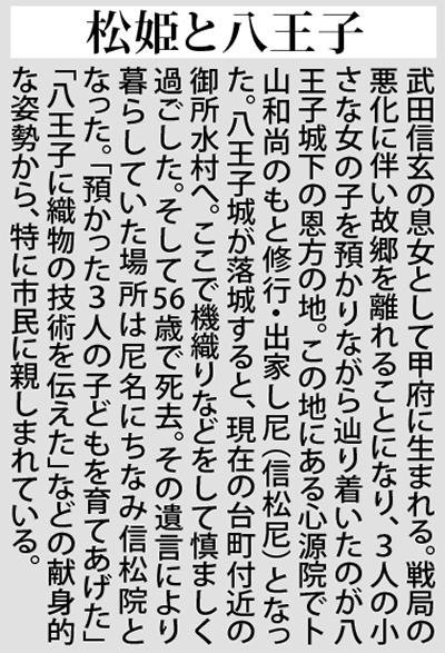 松姫は武田信玄子息女で、八王子にかかわる歴史上の人物の中でも、特に市民に愛されている存在である。今回のイベントはそれぞれゆかりのある両院等で行われる。