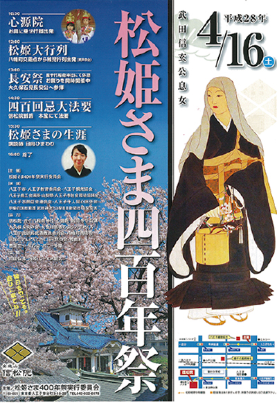 台町の「信松院(しんしょういん)」に眠る戦国時代の尼「松姫さま」(1561-1616)の没後400年を記念したイベントが市内で行われる。4月9日(土)から15日(金)までは下恩方町の「心源院」で坐像の「ご開帳」が、16日(土)には信松院で「四百年祭」が企画されている。
