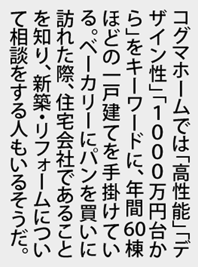土日ともなると家族連れであふれ、観光スポットのように賑わう。梅坪町のハウスメーカー「コグマホーム」は2013年、昭島市から新滝山街道沿いの現在の地=右上写真=へ移転。その際、本社社屋に併設する形でパン店「コグマベーカリー」をオープンした。