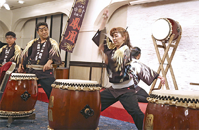 懇親会の催しとして建設業「アイワライフ」(椚田町)の吉田明仁社長が会長を務める太鼓チーム「鳳凰」が演奏を披露=写真=、吉田社長自らも叩き、仕事とは違った一面を見せた。