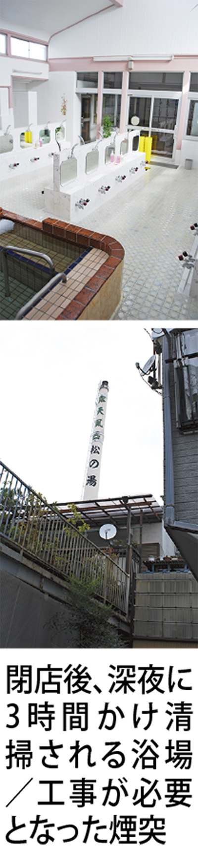 店主の小嶋誠さん(74)=上写真=が閉店を決めた大きな理由は建物の耐震工事、煙突の補修工事の必要性が生じたこと。都内銭湯の利用者数は減少傾向にあるが、松の湯にいたっては常に賑わいをみせていたため閉店を驚く人は少なくない。「ボランティアで手伝うから続けてほしい」。そんな訴えもあった。近隣の高齢者向け衣料販売店では「うちによってから銭湯へ足を運ぶ人も多かった。あそこはお年寄りの『しゃべり場』だった」と残念がる。