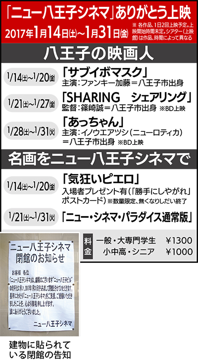 1月31日(火)をもって閉館となる「ニュー八王子シネマ」(横山町/【電話】042・622・0116)は14日(土)から、70年間の感謝をこめて「ありがとう上映」を開催する。