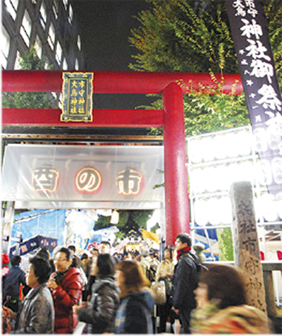 市守大鳥神社は無人神社だが「酉の市」ともなれば、境内は「福を取り込む」熊手を売る屋台などが軒を連ね、商売繁盛を願う人など数万人が訪れる。市内の経営者も足を運ぶ人は多いそう。