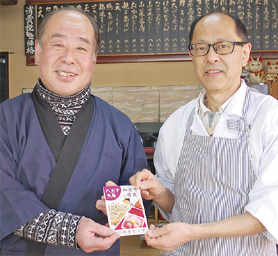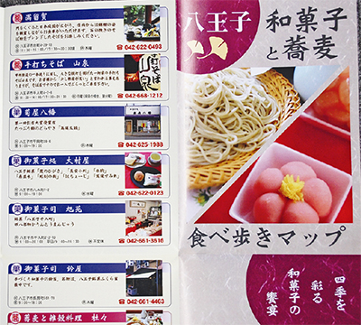 市内32店舗の和菓子店などで構成される「八王子和菓子組合」(楢本康司組合長)は先ごろ、市内蕎麦店(26店舗)が加盟する「八王子蕎麦商組合」(加藤敬一組合長)と合同で両組合店舗が一覧できるマップを製作した。各店舗のほか、八王子市役所などに設置し、「相乗効果」で双方の集客につなげたい考えだ。