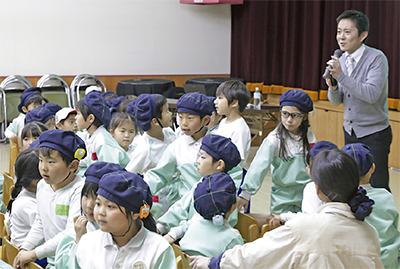 倉部さんは「いいことをすればするほど、みんなの中にある『小さなおじさん』が応援してくれる」、「『お金持ち』よりも『仲間持ち』になろう」とイラストや動画で友達と協力する大切さを伝えた。同園の鈴木真由美主任は「周りの友人を大切にする心をもってもらえれば」と話した。