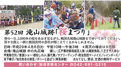 第52回滝山城跡桜まつりが4月8日(土)、都立滝山公園・滝山城跡(高月町・丹木町)中の丸広場で開催される。午前10時から午後3時。雨天の場合は9日(日)に順延。主催は滝山城跡文化協会、加住地区町会・自治会連合会。周辺には5000本ほどの桜(ソメイヨシノ、ヤマザクラ)があり、例年まつりとなると3000人ほどが集まる。