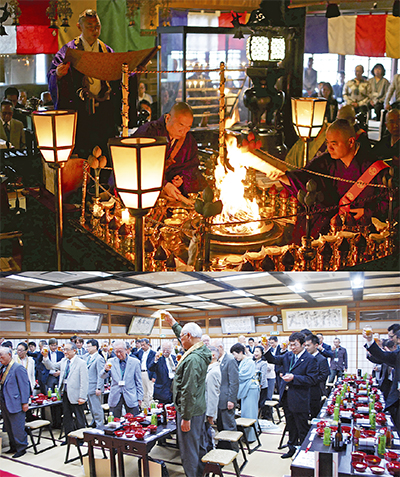 そして大本坊に集まった講員を前に、講元の落合龍太郎さん(まるき社長)は「先代(落合清さん)が作りたいと言った講を副講元、世話人が実現してくれた。供養になる」と頭をさげ、「この講社参拝で感じたことをまわりに伝えてその良さを広めてほしい。有喜講は風通しのいい講にしていきたい」と抱負をのべた。佐藤さんは「仏縁を喜んで。伝統文化を守りつつ新たな力が交わる集いになれば」と挨拶した。