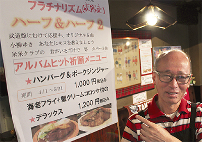 「ハーフと伝えてくれたら、半額にします」。4月、そんな内容の張り紙を出す市内飲食店などが見られた。5月に発売となった八王子「育ち」の4人組バンド「フラチナリズム」のニューアルバム名「ハーフ&ハーフ2」に掛けたCDのPR企画だ。発案者は大和田町で自動車販売店を営む馬場眞由美さん。市内の経営者らも加盟する自身が立ち上げたファンクラブのメンバーに参加を呼びかけ、協力店は13に及んだ。「昨年に続き2回目だが、各店の集客にもつながり。効果はまずまず」と馬場さん。企画に参加した同町の洋食店「パブ&レストランミッキー」の根津光男さんは「これまでもフラチナを応援してきたが、当店がファンの交流場になるなど、お店の新規客の獲得につながっている。昨日は北海道からファンが来た」と、フラチナグッズに囲まれた店内を見渡しながら話す。