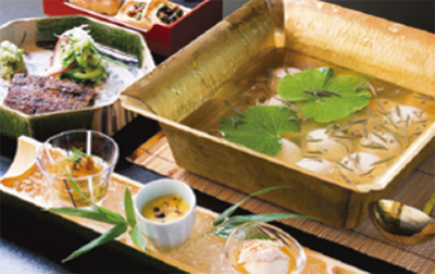 期間中は、じゅんさいと自家製とうふを冷たい昆布の出汁で味わう「二ツ井とうふ」を楽しめる、「ゆかた祭りコース」(6480円)=写真=を用意する。