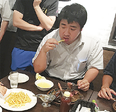 ステーキ500g、ライス200g、フライドポテト200g、そしてコーンスープのセットを1人1人がそれぞれ食べ、リレー方式で競う。5人全員が完食したタイムで順位が決まる。