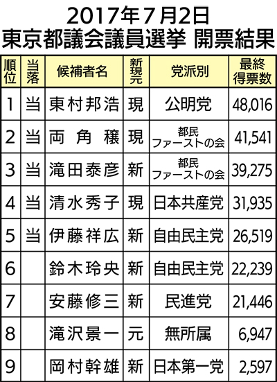 東京都議会議員選挙(定数127)が2日投開票された。定数5に対し9人が立候補した八王子市選挙区は東村邦浩氏(公明党・現)、両角穣氏(都民ファーストの会・現)、滝田泰彦氏(同・新)、清水秀子氏(日本共産党・現)、伊藤祥広氏(自由民主党・新)が当選した。トップ当選の東村氏は5選、2位の両角氏は2選、4位の清水氏は6選となる。市内の投票率は52・49%で、2013年の前回(47・19%)より5・3ポイントあがった。