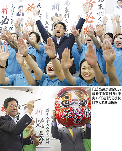午後8時2分、当選確実の一報が届くと、甲州街道沿いに構えられた東村氏の事務所は大きな歓声に包まれた。前回に続きトップ当選の東村氏は「民進、共産のように国政の話題を訴えることも、ファーストのように風が吹いていた訳でもない。都政の問題をどう解決し展望をどう開くか地道に訴えた」と選挙戦を振り返った。今後は「子育てと教育、介護」に注力していくとしている。