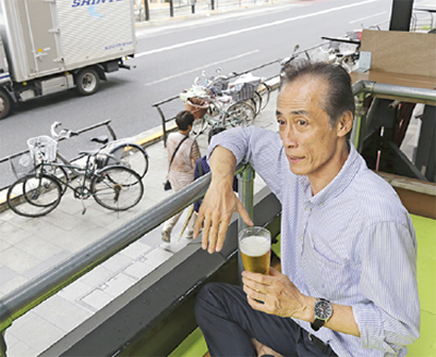 1年の中で八王子まつりの3日間だけ使用される坂福(横山町6の10)の桟敷席。「ここから夜店や山車を見るのは最高の贅沢ですよ」と店主の大洞敏男さん。中2階ともいうべき絶妙な高さは、山車や屋台といったまつりの雰囲気を味わいながら、人混みを避けてのんびり楽しめる贅沢な空間。席チャージ1時間1000円。ビール1杯500円。鮎の塩焼き600円。屋台購入品の持ち込み可。