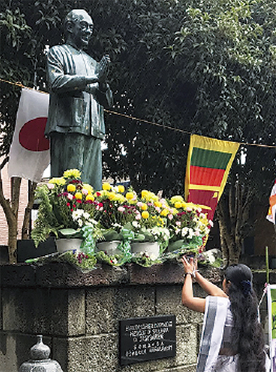 9月中旬、山田町の雲龍寺(うんりゅうじ)(足利正尊住職)に大使らスリランカ政府関係者が訪れた。当日は同国ジャヤワルダナ元大統領の生誕111年にあたる日で、一行は同寺にある元大統領の銅像をお参りするなどした=上写真。